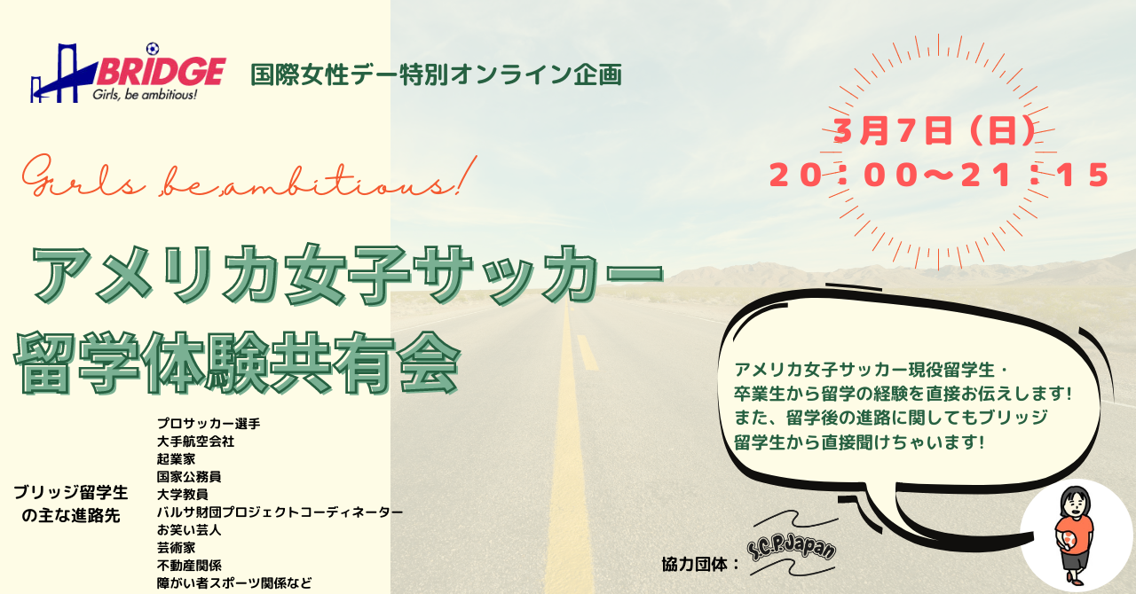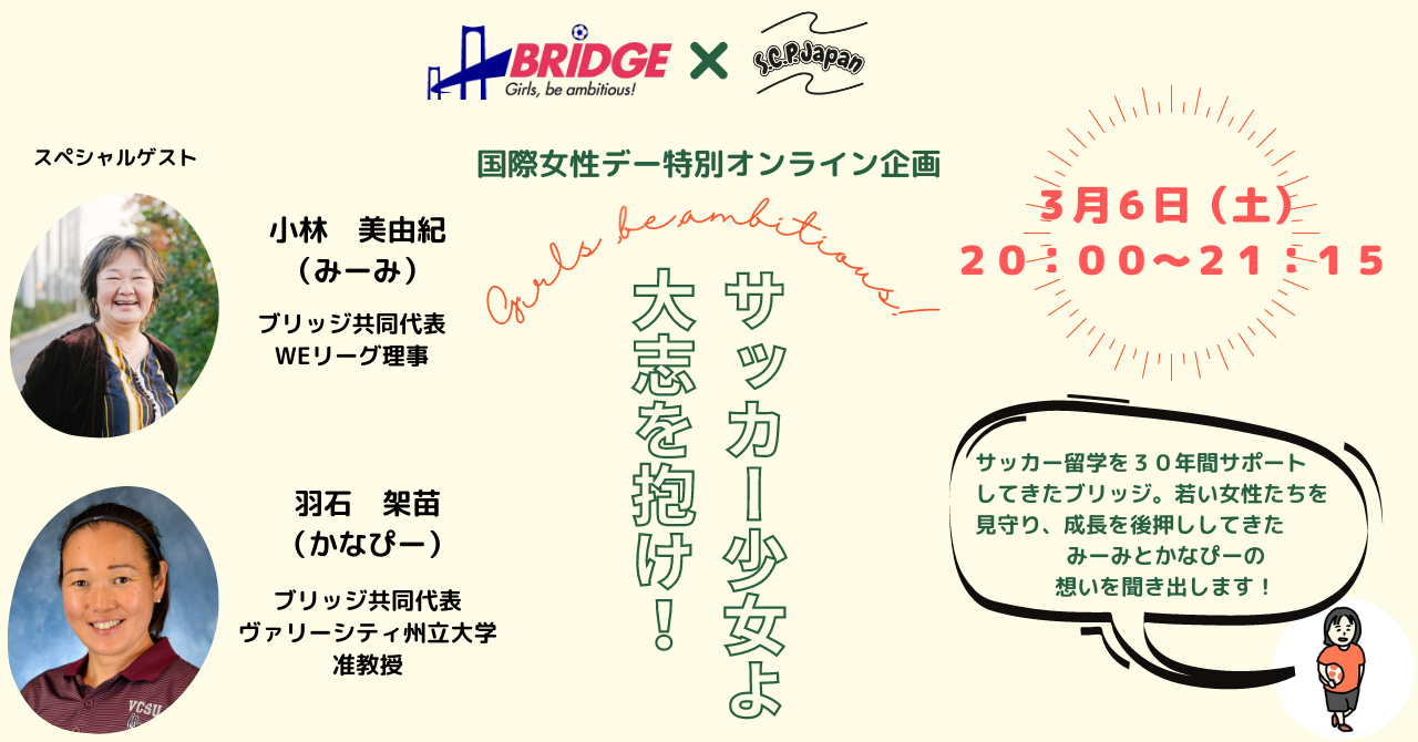 1日目の3月6日(土)は女子サッカーブリッジの共同代表のお二人にゲストとしてご参加いただき、お話を聞かせていただきます!(詳細は下記のリンクよりご確認ください)